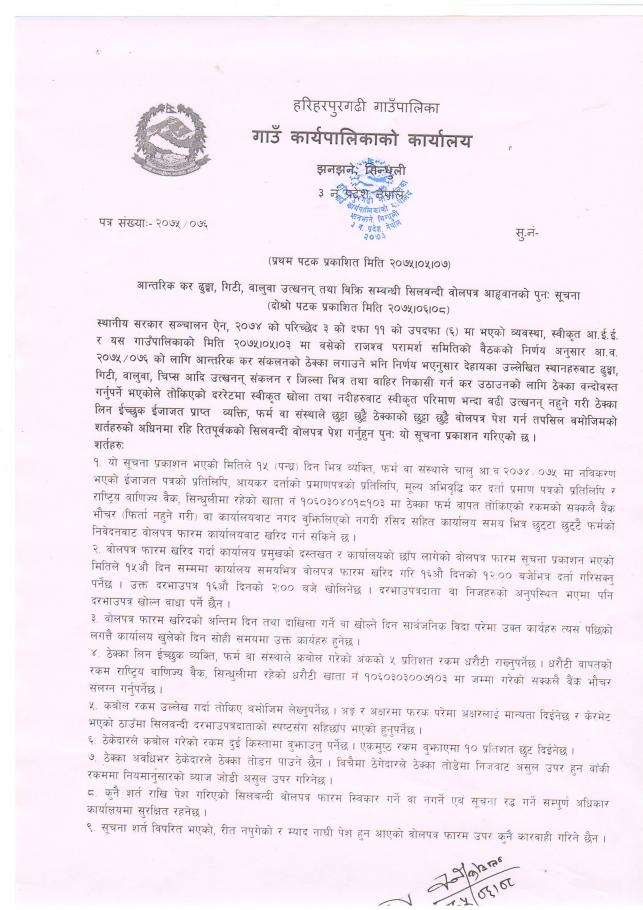आन्तरिक ढुंगा गिट्टी बालुवा उत्खनन तथा बिक्रि सम्बन्धि बोलपत्र आब्हानको सूचना