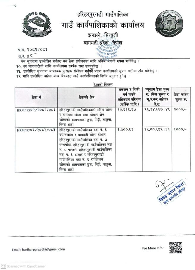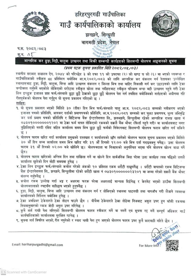 आन्तरीक ढुङ्गा गिट्टी बालुवा उत्खनन् तथा विक्री सम्वन्धि कार्यहरुको सिलवन्दी आव्हानको सूचना।