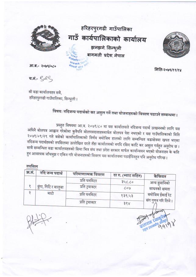 नदिजन्य पदार्थको कर असुल सम्वन्धि गर्ने तथा योजनाहरुको विवरण पठाउने सम्वन्धमा।