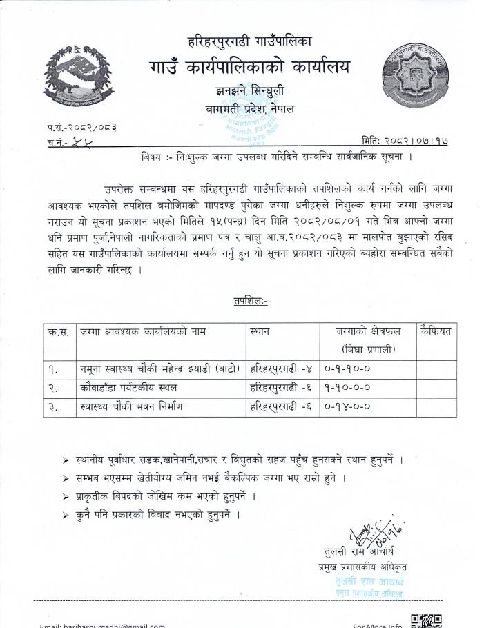 निशुल्क जग्गा उपलब्ध गरिदिने सम्वन्धि सार्वजानिक सूचना ।