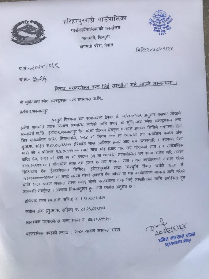 परफरमेन्स बन्ड लिइ सम्झोैता गर्न आउने सम्वन्धमा ।