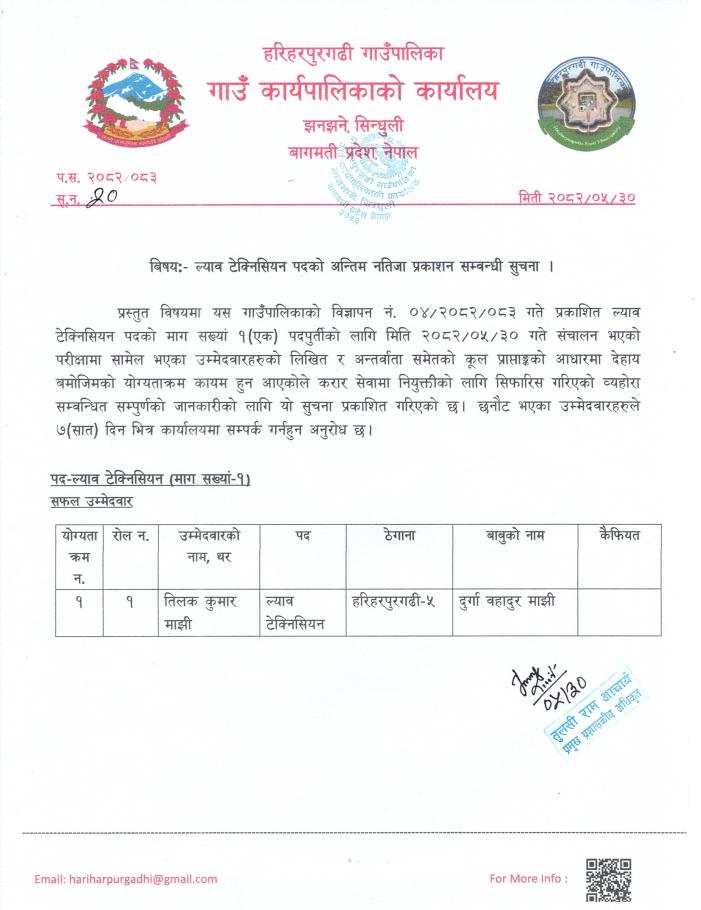 ल्याव टेक्निसियन पदको अन्तिम नतिजा प्रकाशन सम्वन्धी सूचना।